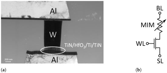 Structure of a 1T1R cell [10]: (a) SEM picture of the Metal-Insulator-Metal (MIM) stack. (b) Schematic representation of the 1T1R configuration.