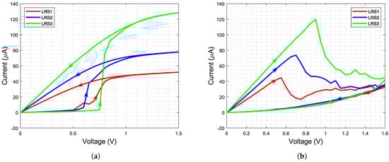 Figure 3a,b shows the measured I-V curves of the RRAM cells. The measurements were done by performing a DC sweep from 0 to for set and reset operation. During the set of the BL voltage and during reset, the SL voltage was swept while the other line was grounded, respectively. Clearly, three different low resistance states (LRS) can be distinguished. It has to be pointed out that the shown curves are the median of the measurement of several cells located in an array and not of a single RRAM cell. During the set process, the LRS, to which the cell is programmed, is determined by the gate voltage applied at the WL. This WL voltage limits the programming current, therefore selecting the programmed state. Table 1 shows the four states (three LRS and one high resistance state (HRS)) and their corresponding resistance values as well as the WL voltages used during programming of the respective state. The WL voltage during reset has to be higher since the pulse is applied to the SL, which means neither drain or source of the selection transistor are grounded. Therefore, the gate voltage has to be raised to achieve sufficient voltage between gate and source to switch the transistor on.