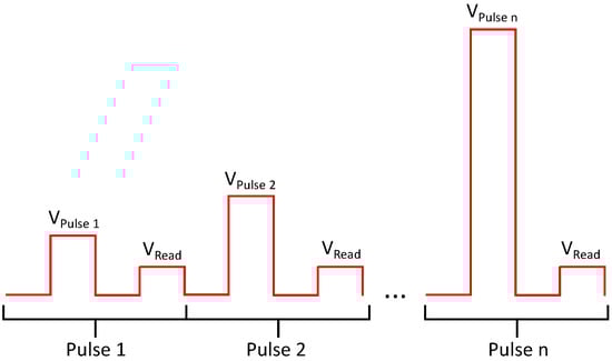 The memory cells are read and programmed by voltage pulses of different height, length and polarity. The programming is done using the “Incremental Step Pulse and Verify Algorithm” (ISPVA) [13,14]. Figure 4 illustrates the algorithm. To control the cell-to-cell variability, the algorithm applies a voltage pulse and reads the cell resistance after the pulse. If the cell resistance corresponds to the desired value, the algorithm is ended, if not, a slightly higher pulse is applied next before the cell resistance is read again. This process is continued until the desired resistance value is read by a read pulse. In this way, the programming of the correct value is secured.