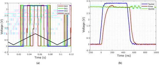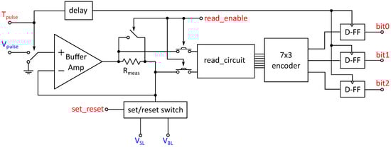 Figure 11a shows the measurement results of the read circuit shown in Figure 7a, where the thermometer output code is encoded as binary. was set to 300 , which corresponds to the realistic pulse height of a read pulse. A rectangular signal between 200 and 1 is fed to the input. Utilizing Equation (3), this represents a cell resistance between kΩ for 1 and basically an open circuit for 200 , since it is below the read voltage. The red, green and blue signals represent the digital output bits, coded in binary, while bit0 in red represents the least significant bit (LSB) and bit2 in blue the most significant bit (MSB). With this setup, the switching voltages of the bits can be observed, thereby determining the range of the read circuit.