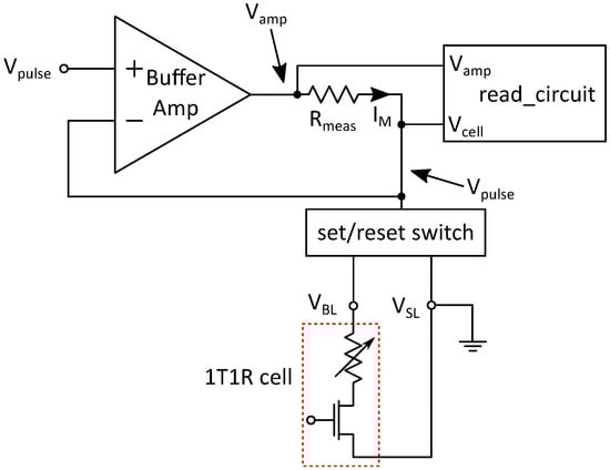 Rcell is the analog value that holds the memory information to be extracted. is independent from Rmeas since the buffer amplifier regulates the voltage over the cell according to the input voltage. With Equation (1), the voltage drop over Rmeas can be calculated: