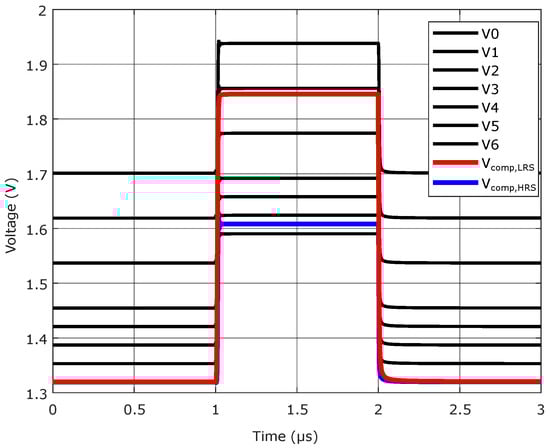 In Figure 9 the simulated voltages inside the read circuit during a read operation are shown. Here, a pulse width of 1 was chosen. The pulse width has an influence on the necessary switching voltage as well as cell variability [19]. A pulse width of 1 is a compromise between programming speed and the necessary pulse height for programming. The voltages V0 to V6 are the systematically raised voltages of in Figure 7a, which are applied at the negative inputs of the comparators. The red line shows for a measurement of a cell in LRS, while the blue line represents for a HRS cell. It can be observed that is significantly lower, since the cell current and therefore the voltage drop over the measurement resistor and is lower. The voltage conditions for the HRS cell will lead to a thermometer code of 0000001, since is greater than the first raised voltage in the resistor tree. This results in a read value of 001 in binary. For the measurement of a LRS cell, the lower cell resistance generates a higher and more comparators are switching. The thermometer code at the output is 0011111 or 101 in binary.