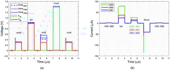 Simulation results of the system: (a) Voltages and (b) currents. The first read pulse, where all cells are in high resistance state (HRS), is followed by a writing pulse, that sets all cells to different low resistance states (LRS). This is verified by the second read pulse. After the reset pulse, all cells are back in HRS.