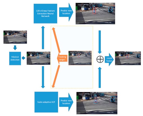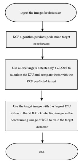 Because the magnitude of the target scale change is not too large, fixing the KCF’s scale change problem is not difficult. In a new image frame, the target bounding box predicted by the KCF could be combined with the pedestrian bounding box detected by YOLOv3 to obtain a new scale that matches the size of the tracking target. Then, the new target box could be used as the training template of the KCF target detector so that the scale adaptation of the KCF can be realized. The process is shown in Figure 2.