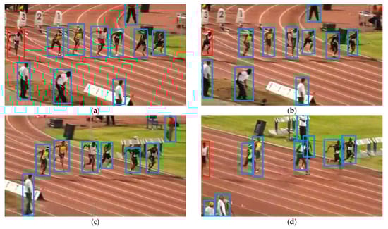 SCKFMDF solves the occlusion problem by comparing the deep features of 128-dimensional vectors of different people. (a) Tracking target is labelled with red bounding box; (b) tracking target is gradually left by the camera view for his slow running; (c) tracking target is completely lost in the camera view; (d) tracking target reappears and is found by SCKFMDF and labelled with red bounding box.