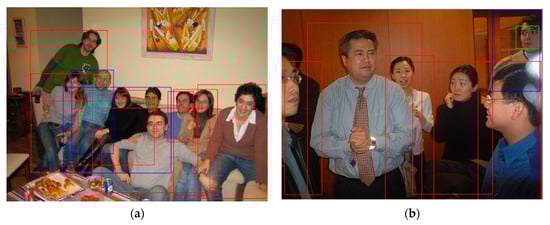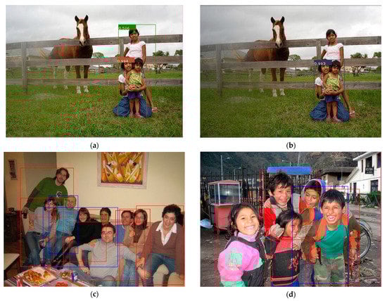 In the retrieval algorithm, the FHOG (Felzenszwalb histogram of oriented gradient) features of face images are extracted from the face dataset, and these feature data are used to train an SVM (Support Vector Machine). Along with using NMS and a sliding window to crop an image, faces can be detected in images. Additionally, in the improved YOLOv3, after having detected all human instances, all the faces in the image need to be detected, as seen in Figure 5. Ideally, each detected face bounding box is fully inside the human bounding box. Thus, if there a detected face bounding box is outside the human bounding box or overlapping with a human bounding box, it must belong to an incorrectly removed human bounding box. Thus, all human bounding boxes removed by Soft-NMS are searched again to find one that fully covers the face bounding box and has the highest confidence. In Figure 5, it can be seen that the green bounding boxes detected faces that were not fully inside the human bounding boxes, so human bounding boxes missed by Soft-NMS had to exist. Additionally, the missed human bounding boxes are recovered by the retrieval algorithm and bounded in blue.