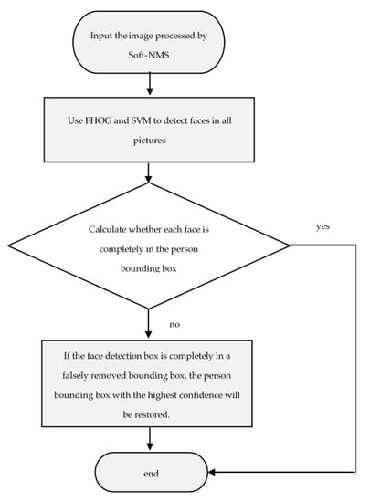 If there is a face-detected bounding box outside or overlapping with the person-detected-bounding box, the model searches for all the original detected bounding boxes that have not been deleted by the Soft-NMS algorithm. The model calculates which one of them completely covers the face-detected bounding box and finally finds the person-detected bounding box with the highest confidence. Then, the person-detected bounding box is retrieved and restored, so the accuracy of person detection is improved. Figure 6 shows the flow chart of the retrieval algorithm.