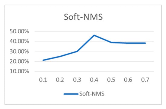 In the experiment, we set the NMS overlap threshold to the default value of 0.3, which was the value found by the author to obtain the highest accuracy. For Soft-NMS, in addition to the overlap threshold, Nt, set to 0.3, there was also a, σ, set by the Soft-NMS author. By comparing the object confidence with this threshold, the detected bounding box of the error prediction was finally removed. The σ value was set to 0.4. Setting the threshold too high would have removed all the detected bounding box, and setting the threshold too low would have reduced the detection accuracy because when the detected bounding box has a very high overlap rate, it is more likely to be a repeated detected bounding box. Setting a low threshold meant that the detected bounding box would rarely be removed. After trying many values for this threshold in the PASCAL VOC 2007 dataset, we got the highest accuracy when it was set to 0.4 (as seen in Figure 8). The input resolution of the network was set to 416. After detecting the PASCAL VOC dataset, we calculated the accuracy of the detection. The accuracy of YOLOv3 using traditional NMS and YOLOv3 was improved after using Soft-NMS and the retrieval algorithm, as shown in Table 2.