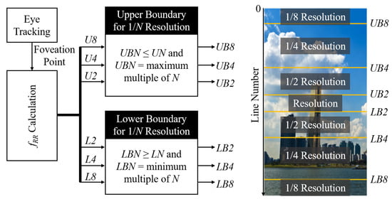 The previous foveated display [14] employed eight-output shift registers in gate driver circuits. While a variety of pulse timings are programmable within the outputs of one shift register, there should exist one-clock shifts between adjacent shift registers. Consequently, it has to be ensured that output pulses of the same timing are generated only in a single shift register. Using the foveation point obtained by an eye tracking module and , upper and lower region boundaries of 1/2, 1/4 and 1/8 resolutions are calculated accordingly, where U2, U4 and U8 are the boundary line numbers for upper regions and L2, L4 and L8 for lower regions. Then, the boundaries of regions are adjusted to be multiples of tw, four and eight, which guarantees that multiple pulses with the equal timing are given rise to in a shift register. For the upper regions, the adjusted values (UB2, UB4 and UB8) are determined to be maximum multiples that are equal to or smaller than U2, U4 and U8. Conversely, the values of the lower regions (LB2, LB4 and LB8) are adjusted to be minimum multiples that are equal to or larger than L2, L4 and L8. As a result, no resolution regions are overlapped over two shift registers. This boundary adjustment is summarized in Figure 2.