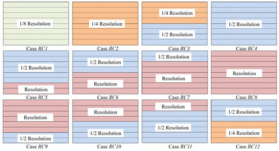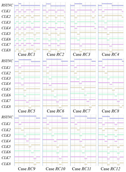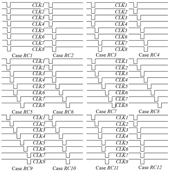 After the boundaries are computed, clock pulses are controlled to generate gate pulse waveforms corresponding to regions. Since output pulses of multi-output shift registers are equivalent to clock pulses during their output periods, it is required to change clock waveforms according to the resolution of the panel region driven by gate pulses. In the region of a shift register, there are 12 possible cases, as shown in Figure 3, which can be determined from boundary values. For example, when the foveation point is placed on the center of a display, the top region can be assigned with 1/8 resolution. As the region gets closer to the foveation point, the resolutions increase up to the original resolution through the case RC1 to the case RC8. After passing the center, the resolutions decrease down to 1/8 resolution at the bottom area through the case RC9 to the case RC11, the case RC4, the case RC12 and the cases RC2 and RC1 again. The cases RC3, RC5, RC6, RC7, RC9, RC10, RC11 and RC12 represent that the boundaries are located at the inside of the region controlled by one shift register. After one region case is determined, a corresponding clock waveform is selected among 12 cases, as illustrated in Figure 4, and are transferred to shift registers. In a 1/8 resolution region, all eight clock signals give rise to pulses at the same time. In the same way, in 1/4 and 1/2 resolution regions, four and two clock signals provide pulses at the same time. Then, for the original resolution region, clock signals should be shifted over their previous ones by one pulse width.