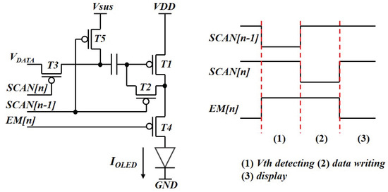 As mentioned above, high quality OLED displays need to compensate for variations on TFTs’ electrical characteristics over area and time as well as supply voltage drops. The example pixel circuit shown in Figure 5 [27] is able to compensate for both threshold voltage () of T1 and voltage drop of VDD. In the detecting period, the capacitor stores the voltage of and the following data writing period programs the gate voltage of T1 at leading to the OLED current () independent of VDD and at the display period, as described in Equation (4), where k is a coefficient.