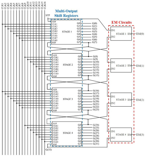 The control signal of EM connected to a p-channel TFT (T4) is applied at the high voltage level to make the drain of T1 floating and to keep the OLED from emitting the undesired light during both detecting and data writing periods. These EM pulses, which are wider than gate pulses, have been generated by additional shift registers with wide clock pulses or programmable pulse width shift registers [28,29,30]. While previous circuits maintain the pulse width of EM signals to be equivalent for all pixels, EM pulse widths for these foveation-based driving pixels should be adjusted differently depending on the resolution of the driven panel area. The proposed scheme assigns one EM signal to eight lines driven by one multi-output shift register. That is, all pixels in these eight lines are turned off during the same period of time that is different according to the resolution of the assigned region.