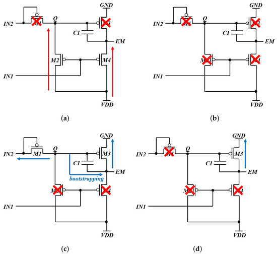 Four periods of the proposed EM circuit: (a) pulling-up; (b) holding-high; (c) bootstrapping; and (d) holding-low.