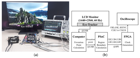 The variable clock generation circuit was evaluated using 60 Hz 1440 × 2560 liquid crystal display (LCD) monitor, eye-tracker (Tobii Eye Tracker 4L) [32], computer, programmable system on chip (PSoC) board (Cypress PSoC 5LP) [33] and field programmable gate array (FPGA) board (Terasic DE2-115) [34], as shown in Figure 9a. The eye-tracker is attached at the bottom of a monitor to capture the foveation point, which is sent to a computer via a universal serial bus (USB) interface. The computer estimates the coordinate of the foveation point and transmits it to a PSoC board with an USB interface. Because the used FPGA board cannot handle the USB interface directly, the PSoC is used to convert the USB data into serial peripheral interface (SPI) data. In addition, because the PSoC contains a central processing unit (CPU), it calculates boundary values of UB2, UB4, UB8, LB2, LB4 and LB8 and transfers them to a FPGA board through the SPI. These resolution boundaries are calculated at the viewing distance parameter, of 0.35. Finally, the FPGA board outputs VBLANK, RSYNC and 16 clock signals of CLK1 to CLK16. VBLANK is the signal that indicates the vertical blank period, and RSYNC is used to show the specific region case in the oscilloscope. This connection is explained in more details in Figure 9b.