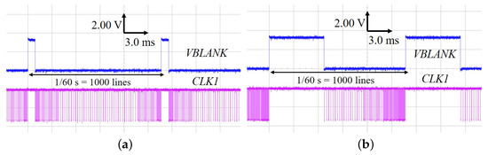 Additionally, the variation of the reduced vertical resolution from the maximum to the minimum is realized by changing the foveation point from the center position to the uppermost position on the monitor. Then, the clock signals are generated based on the foveation points obtained by the eye tracker. To keep the frame time at the constant value, the vertical blank length is adjusted as depicted in Figure 12. The pulse interval of CLK1 is wider at the higher resolution area because outputs of one shift register are generated for more line times. Thus, the foveation point area is recognized by finding where the sparser CLK1 pulses appear. In our evaluation setup where the frame time is fixed at 1000 lines, while lengths of active and vertical blank areas are 950 lines and 50 lines for the foveation point at the center, they are adjusted to be 602 lines and 398 lines at the uppermost. All clock pulses of the vertical blank period are deactivated.