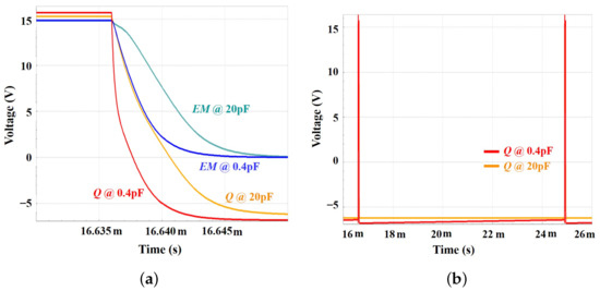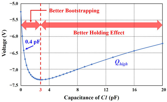To determine C1, changes of holding effect, bootstrapping and falling time at the Q node are investigated regarding its capacitance. If C1 is given as 0.4 pF to be much smaller than the capacitive load at EM, Q reaches to a floating state of GND+|| earlier than EM leading to the big voltage difference between Q and EM, as presented in Figure 13a. This achieves large bootstrapping at Q that results in the fast falling transition at EM. Conversely, because the large C1 of 20 pF slows down the falling transition of Q, it causes the small difference between Q and EM, degrading the bootstrapping of Q and the falling speed of EM. However, the larger C1 improves the holding effect leading to the reduced voltage rise caused by the leakage currents, as shown in Figure 13b. Consequently, there exists the trade-off between holding effect and bootstrapping where the larger C1 degrades the bootstrapping effect with better holding capability, but the smaller C1 increases the voltage rise at Q by the leakage current with larger bootstrapping. Since the maximum boosted Q voltage for a frame time () is important to maintain the turning-on state of a pull-down TFT (M3), the capacitance of C1 is determined using the plot of , as shown in Figure 14. When C1 is less than 3 pF, the full bootstrapping effect takes place but the current leakages pull up the Q voltage level during a frame time owing to the poor holding effect. On the other hand, when C1 is larger than 3 pF, the boosted voltage level at Q goes up due to the bootstrapping degradation in spite of the improved holding performance. In addition, considering the size of the EM circuit, the final C1 has been determined as 0.4 pF with of −6.4 V, where the falling transition of EM is completed in a line time of around 4 μs.