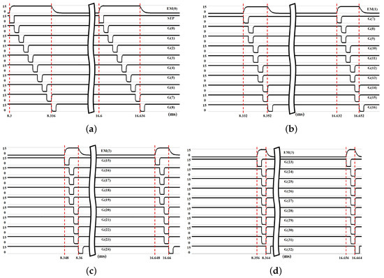 The simulation was conducted for the configuration of shift registers and EM circuits in Figure 7 where the first, second, third and fourth stages are assigned to , , and regions, respectively. Their corresponding cases of clock waveforms are RC8 for , RC4 for , RC2 for and RC1 for in Figure 4. The simulated waveforms are shown in Figure 15. As a consequence, the first shift register of produces eight shifting pulses from G(0) to G(7) and the corresponding EM circuit generates the EM(0) pulse of the low level during nine line times. In the same fashion, the second shift register and EM circuit of build gate pulses from G(8) to G(15) and EM(2) of five line times, the third ones of from G(16) to G(23) and EM(3) of three line times and the fourth ones of from G(24) to G(31) and EM(4) of two line times.