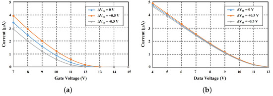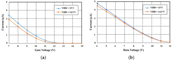 In addition, 32 p-channel TFT pixel circuits of Figure 5 are evaluated by SPICE along with four shift registers and four EM circuits of Figure 7. The and VDD variations of ±0.5 and −0.5 V are taken into account at of 12 V. The OLED current curves over the variation are plotted in Figure 16a,b without and with pixel compensation. The OLED current characteristics over the VDD variation are shown in Figure 17a,b without and with pixel compensation. It is verified that, while the average current errors without pixel compensation show 166.6% and 34.2% over the gate voltages from 7 to 15 V, the average current errors over the data voltages from 4 to 12 V are reduced to 4.4% and 5.5% by pixel compensation circuits integrated with proposed diving circuits.