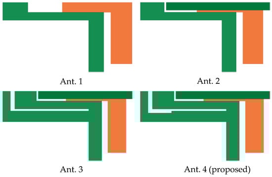The proposed antenna is generated by the evolution demonstrated in Figure 2. Ant. 1 is a structure composed of an L-shaped feeding strip and a Z-shaped radiation strip. By adding a parasitic rectangle strip to Ant. 1, Ant. 2 is obtained. Compared with Ant. 2, Ant. 3 has an additional L-shaped strip. The gaps between the L-shaped and Z-shaped strip are 0.5 mm and 0.2 mm, respectively. Compared with Ant. 3, Ant. 4 cuts a rectangular slit on the additional L-shape strip.