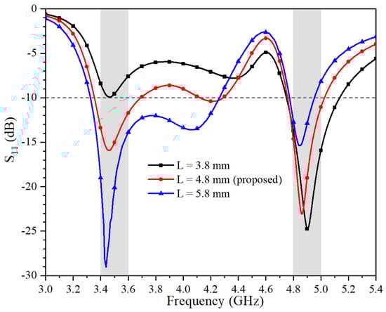 Simulated S11 of the proposed antenna with different values of L.