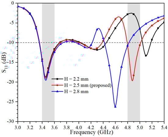 Simulated S11 of the proposed antenna with different values of H.