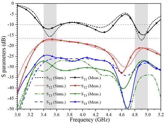 Figure 7 shows the S-parameters which are measured by Keysight Vector Network Analyzer N5224A. It can be seen that the measured S11 can cover both 3.5 GHz (3.4–3.6 GHz) and 4.9 GHz (4.8–5 GHz) frequency bands, and the isolation is higher than 16.5 dB. The measured isolation between various ports agrees well with the simulated results. The slight frequency offset is mainly due to SMA connective errors.