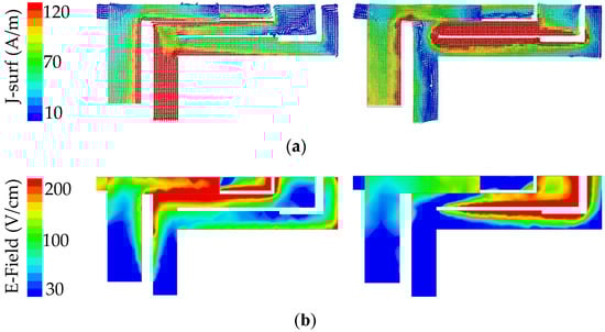 In Figure 8, the simulated surface current at 3.5 GHz is mainly distributed at the gap between the rectangular strip and the Z-shaped strip. At 4.9 GHz, strong current intensity is observed at the gap between the L-shaped strip and the modified Z-shaped strip. The distribution of the electric field is mostly the same as the distribution of electric current.