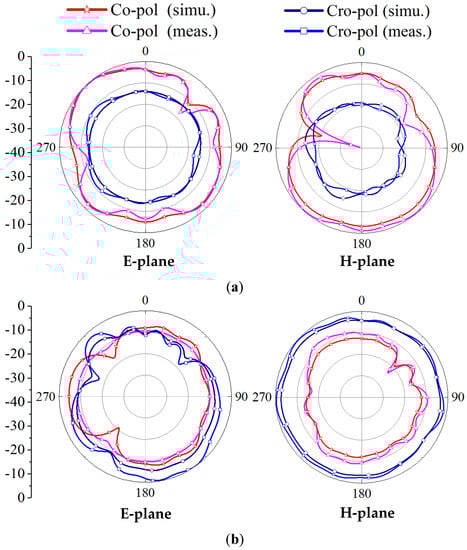 The radiation patterns of the proposed antenna element at 3.5 GHz and 4.9 GHz are shown in Figure 9, respectively. The measured co-pol and cross-pol are represented by different symbol lines. E-plane represents the direction in which the feed current flows, and H-plane is perpendicular to that direction. As shown in the E-plane radiation patterns of Figure 9b, the radiation between the feeding strip and the ground is taken into account, resulting in a similar gain between the co-pol and cross-pol.