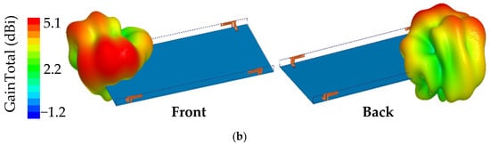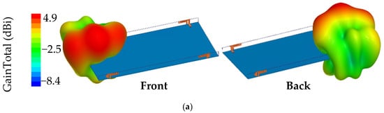 In Figure 10, the 3D radiation patterns of a single antenna element as seen from the front side and back side of the substrate are presented, respectively. The maximum gain at 3.5 GHz and 4.9 GHz are 4.9 dBi and 5.1 dBi, respectively. The gains are high enough to meet the requirements of most mobile phone antennas.