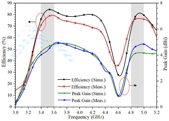 The measured total efficiency and peak gain, as shown in Figure 11, are better than 70% and 4 dBi, respectively. The 3.5 GHz and 4.9 GHz frequency points obtain the maximum total efficiency about 85% and 82%, respectively, while the 3.6 GHz and 5 GHz frequency points have the maximum peak gain about 4.7 dBi and 5 dBi, respectively. The measured efficiency is generally lower than that of simulation, which is mainly due to the current skin effect caused by excess solder and the loss of the chamber. The measured total efficiency and peak gain are in good agreement with the simulation results.