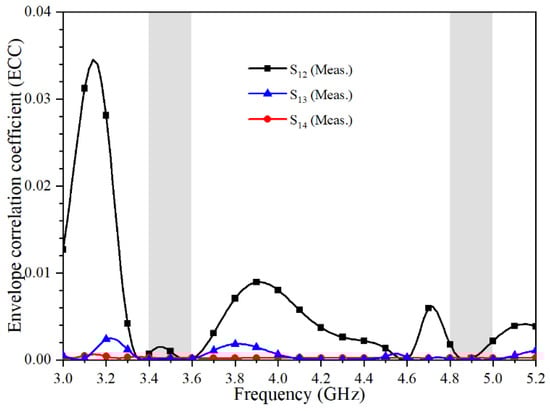 The envelope correlation coefficient (ECC) between radiating elements is a critical parameter of the MIMO antenna. The ECC can be calculated by the measured S-parameters according to the below equation.