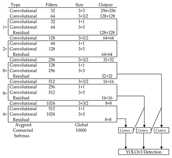 The YOLOv3 algorithm proposes a new feature extraction network Darknet-53 on the basis of Darknet-19 and ResNet network structure. The feature extraction network consists of 52 convolutional layers and 1 full connection layer. Convolution is carried out by using 3 × 3 and 1 × 1 size convolution kernel alternately. At the same time, YOLOv3 adopts the multi-scale detection mechanism to detect the feature map of 13 × 13, 26 × 26 and 52 × 52 at three scales, which enhances the ability to extract small targets. Compared with Darknet-19, ResNet-101 and ResNet-152, the Darknet-53 network has obvious advantages in top-1 accuracy, top-5 accuracy and floating-point operations per second. Its network structure is shown in Figure 2.