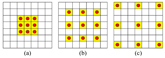 Figure 3 shows the dilated convolution kernel with three different intervals. Rate represents the interval of the dilated inside the convolution kernel. Figure 3a is the dilated convolution of 3 × 3, rate = 1, and the receptive field range of the convolution kernel is 3 × 3. Figure 3b is the dilated convolution of 3 × 3, rate = 2, and the receptive field of the convolution kernel increases to 7 × 7. Figure 3c is the dilated convolution of 3 × 3, rate = 3, and the receptive field of the convolution kernel increases to 15 × 15, which ensures that the convolutional network can extract the feature information in a larger field of vision.