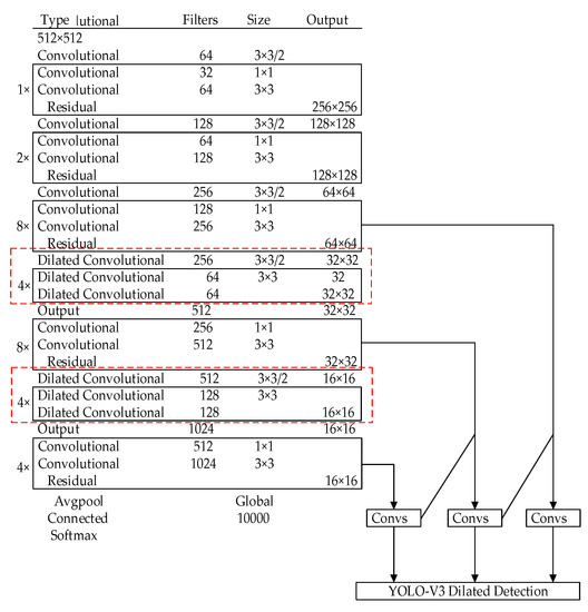 Figure 4. YOLOv3 network structure based on dilated convolution. - In the improved network, the 32 × 32 pixels and 16 × 16 pixels’ down sampling layer are replaced by the dilated convolution structure. The dilated convolution residual block structure [22] is shown in Figure 5. The dilated convolution with the size of 3 × 3 and rate = 2 is used for feature extraction with double channels, thus increasing the receptive field and feature expression capacity of the backbone network as a whole. The introduction of a void convolution residual block has the advantages of fewer network parameters and lower computational complexity of the residual unit. The structure uses 1 × 1 convolution to realize cross-channel feature fusion and better information integration. During training, when image features are transferred to a lower resolution layer, features of all previous feature layers will be received by the latter layer in dilated convolution, thus reducing feature loss. In this way, features can be reused, function utilization increased, and function usage improved between low-resolution convolutional layers.