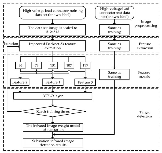 A substation real-time infrared image detection method based on YOLOv3 network structure, add dilated convolutional network to the low resolution original transport layer and use dilated convolution residual block structure to replace the network 32 × 32 pixels and 16 × 16 pixels down sampling layer. The extraction of the low-resolution feature layer is improved, which is more conducive to detecting the fault of the substation high-voltage lead connectors. The structure flow diagram of the test is shown in Figure 6. The specific steps are as follows: