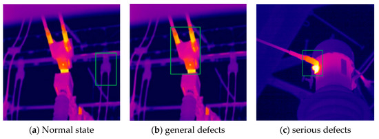 According to the relative temperature difference, the operation state of the joint is divided into three states: normal, general defect and serious defect. Figure 7 shows the infrared images of the high-voltage lead connectors under three operating conditions.