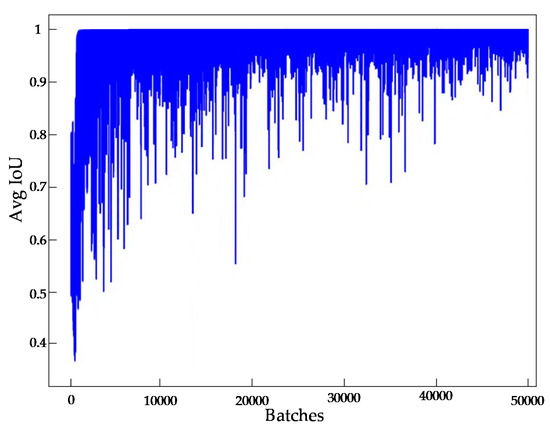 As can be seen from Figure 9, the average IoU at the beginning of the training was below 0.4. With the increase of the number of training iterations, the average (IoU) gradually increased, indicating that the detection accuracy of the model was constantly improving. After 10,000 iterations, it could be maintained at around 90%.