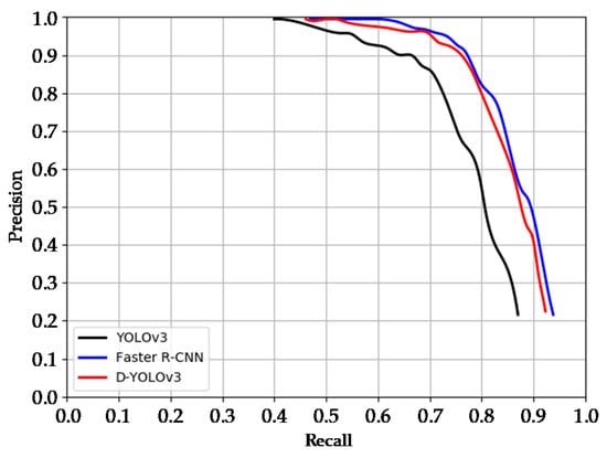 The precision-recall(P-R) curves of YOLOv3, Faster R-CNN and D-YOLOv3 models are shown in Figure 10. By analyzing and comparing the P-R curve of each model, it can be found that the ordinate accuracy in the figure represents the accuracy rate of segmentation of high-voltage lead connectors, while the abscissa recall rate represents the ability of network model to segment all high-voltage lead connectors in the image. Ideally, the P-R curve is a straight line with an accuracy of always 1. The accuracy of the model with good performance should be kept at a high value while the recall rate continues to increase, while the model with poor performance needs to sacrifice a lot of accuracy value in order to improve the recall rate. In terms of detection performance, D-YOLOv3 model proposed in this paper has better performance than YOLOv3 and Faster R-CNN model.
