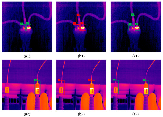 The detection results of three network models: (a1,a2) YOLOv3; (b1,b2) Faster region-based convolutional neural network (R-CNN); (c1,c2) D-YOLOv3.