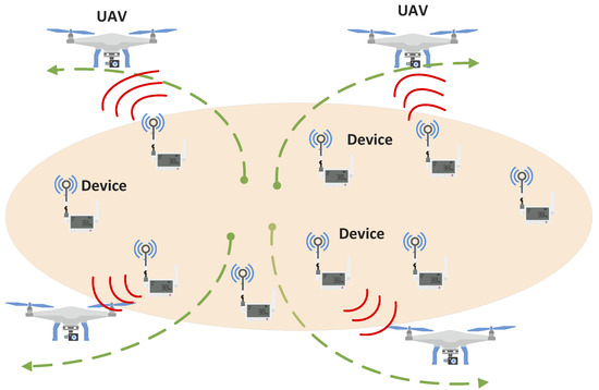 The multi-unmanned aerial vehicle (UAV)-enabled data collection scenario with channel interference, where multiple UAVs are flying in the sky to collect data from served devices and numerous sensors distributed over an area at fixed locations during a certain period. The dotted green lines represent the trajectories of the UAVs.