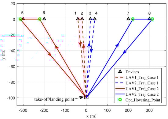 The optimal resource allocation and trajectory solution for the basic network consisting of two UAVs and four symmetrically distributed devices, as shown in Figure 2, is related only to the distribution of the devices. Depending on the device distribution, the possible solutions can be divided into five different cases as follows, where.