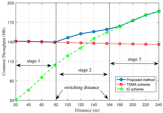 As discussed previously, the scheme adopted in the system can be adjusted between the TD and IC modes. The communication rate depends only on the UAV height when the TD mode is applied, which means that the optimal rate performance of the system is no less than that under the TD scheme. When the two devices are very close to each other, the interference on each receiver arising from the co-working devices is strong; thus, the TD scheme should be employed to optimally harvest data in such an element, and the system should be switched from the TD mode to the IC mode only when the separation distance is sufficient.