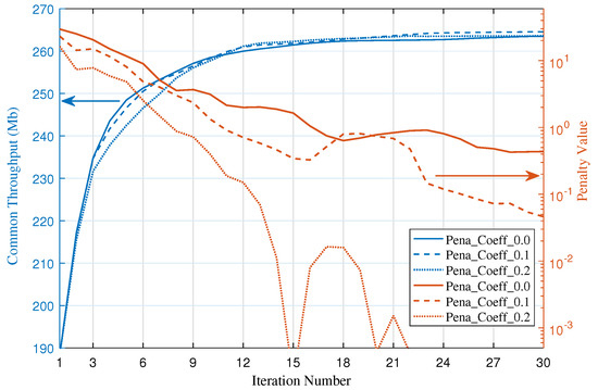 When two UAVs are deployed in the network, our proposed algorithm shows the best performance, with the slope of the corresponding curve being greater than those for the other two schemes; this is because the IC scheme is adaptively applied in our method, achieving an additional communication rate gain in the network by coordinating the interference. Meanwhile, for the CoMP approach, because the number of UAVs is limited, the gain achieved through beamforming is relatively low; thus, this method shows the worst performance.