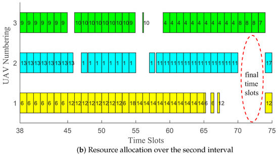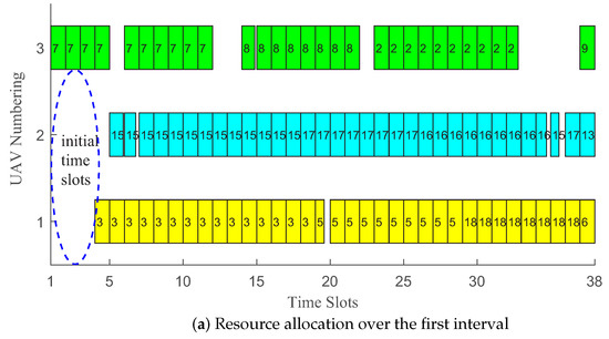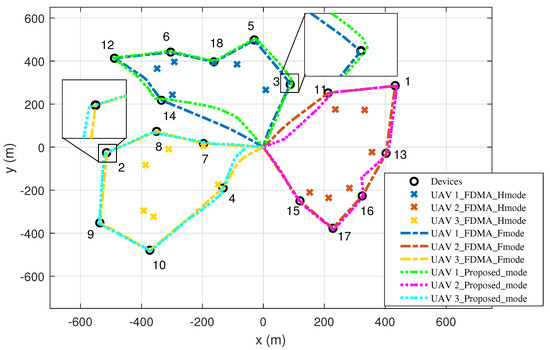 - When, the optimal solution to the resource allocation and hovering placement problem is described as follows. During the first interval,, the system adopts the IC scheme; UAV 1 will be associated with device 1 and hover atto collect data, and simultaneously, UAV 2 will be associated with device 3 and harvest data at. Here,During the second time interval,, the system also adopts the IC scheme; UAV 1 will be associated with device 1 and hover atto collect data, and simultaneously, UAV 2 will be associated with device 3 and harvest data at.
