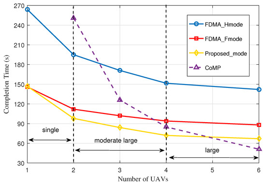 The completion time versus the number of UAVs under different schemes.
