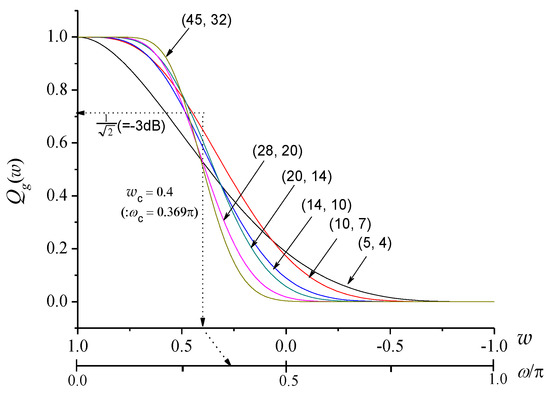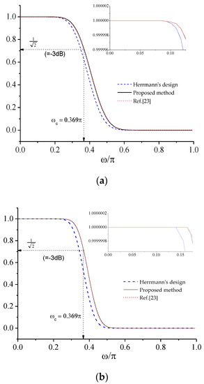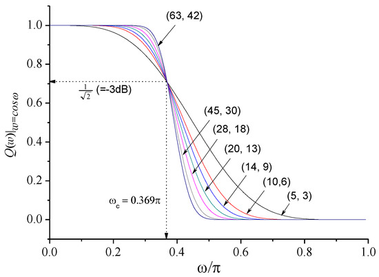 where for a give cutoff-frequency , and denotes the integer part of . For this reason, the classical designs naturally involve an approximate cut off-frequency error [20,22,23]. For example, in the case of (corresponding to in Reference [15]), Figure 1 shows the MAXFLAT FIR filters, which are chosen according to Equation (10) when using Equation (15). It is shown that the MAXFLAT FIR filter has both a passband and stopband that are maximally flat, but its magnitude response never passes through the desired cut off-frequency. Particularly, as the order of filter becomes lower, the cut off-frequency error becomes larger.