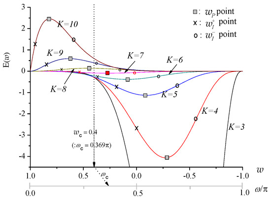 Figure 8, using Figure 6, shows cut off-frequency fixing filters for () and various , and the related values are given in Table 4. Table 5 also indicates coefficients of the cut off-frequency fixing filter for , where and have been obtained according to Equations (20) and (14), respectively.