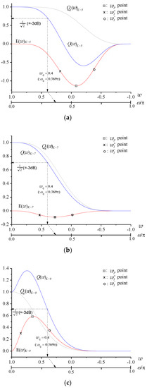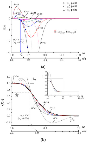 This corresponds to in Table 1 and, as shown in Figure 3b, no overshoot and no undershoot appear in the passband and the stopband. For the further evaluation of this result, in the case of (corresponding to ) and , Figure 4a,b show in terms of and the effect on , respectively. The related parameters are also indicated in Table 2 where and are the peak values of overshoot and undershoot in the passband and the stopband, respectively. It can be seen that taking yields the smallest negative value (at ) and results in and satisfying Equation (26) for a given . Consequently, using potentially leads to yielding a cut off-frequency fixing filter with zero overshoot and zero undershoot (i.e., . Especially, it is shown that the filters by have a tolerant magnitude distortion, but relatively narrower transition band than the filter by .