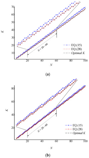 by averaging the upper and lower limit values of Equation (27). To verify the effectiveness of this formula, Figure 5 shows the accuracy comparison of Equations (15) and (28) for () and () where the “★” symbol denotes the optimal chosen by negatively minimizing under condition (27). This indicates that obtained according to Equation (28) are remarkably consistent with the optimal .