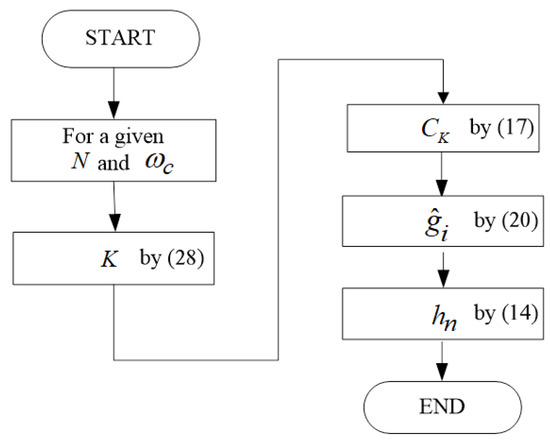 Based on results so far, Figure 6 exhibits a design procedure to directly compute the coefficients of cut off-frequency fixing filters with a desired frequency response. Table 3 and Figure 7 show the comparison between the proposed method and existing methods [15,23] for and . From Table 3, it can be said that the proposed filters apparently are a “cut off error free” and “flat magnitude” since can be very negligible and ignored. On the other hand, previous filters using empirical formula of Equation (15) are maximally flat in the passband and stopband, while there exists a filter cut off-frequency error of 2.2% to 6.6%. In addition, it appears that the iteration training method [23] leads to very slight cut off errors despite performing multiple computations to determine K, as shown in Figure 4 in Reference [23]. Consequently, these examples demonstrate that the proposed method derives accurate FIR filters with a magnitude response while allowing direct and simple computation in designing such a filter.